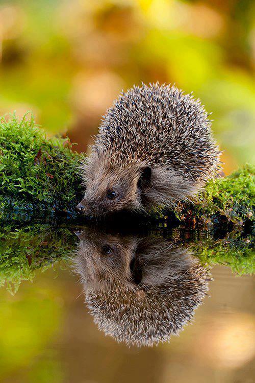 صورة رائعة لقنفذ يشرب الماء من بحيرة ويظهر إنعكاس لصورته في الماء الصافي ... ما أجمل الطبيعة.