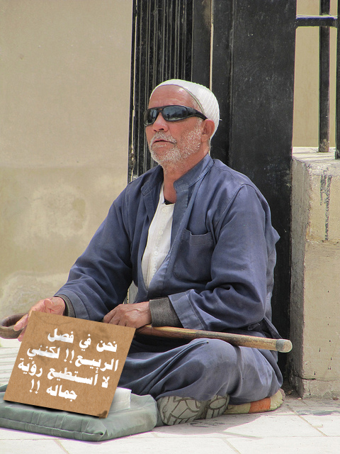 | جلس رجل أعمى على إحدى عتبات عمارة واضعا ً قبعته بين قدميه وبجانبه