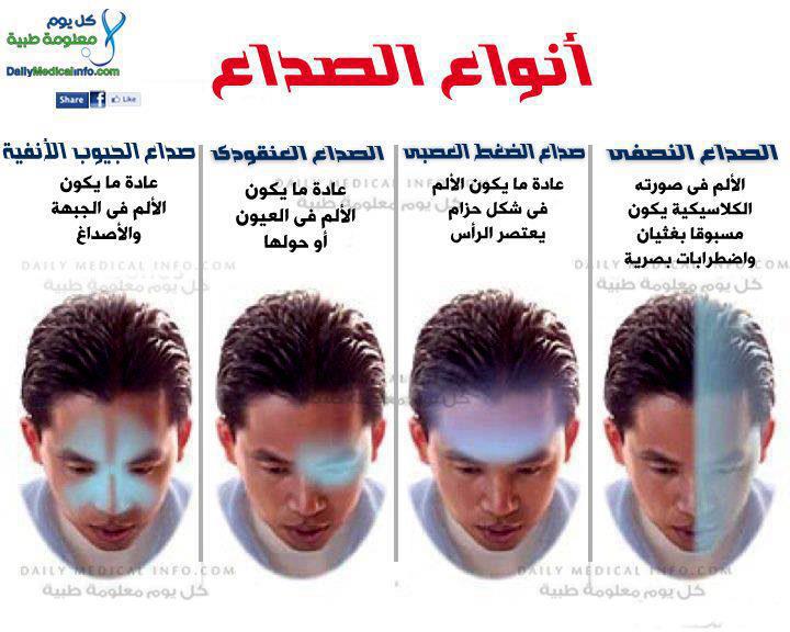 موضح بالصورة أماكن تأثير الصداع أو من الممكن أن نقول اماكن الألم .