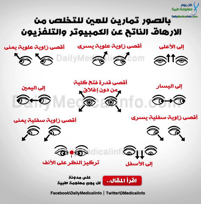 تمارين للعين للتخلص من الإرهاق الناتج عن أستعمال الكمبيوتر ومشاهدة التلفزيون.
