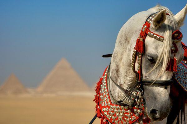 منظر رائع لحصان في منطقة الأهرامات بالجيزة .