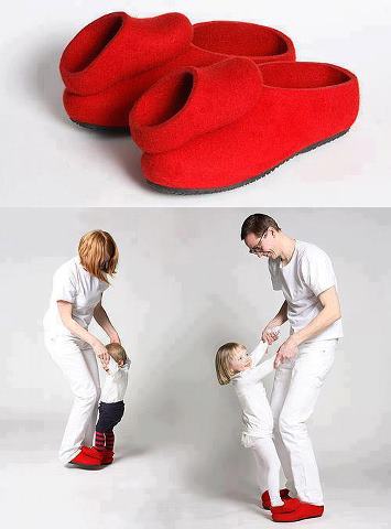 | فكرة جميلة لمداعبة واللعب مع الأطفال ... وهو حذاء للكبار به علي منطقة الوجه مكان كحذاء صغير للطفل حيث يضع الطفل أقدامه الصغير في الحذاء الصغير ويمسك بيد الأب او الأم ويقوم الأب أو الأم بالسير .. فيكون بمثابة مرجيحة للطفلة . فكرة بسيطة ولكن جميلة :)