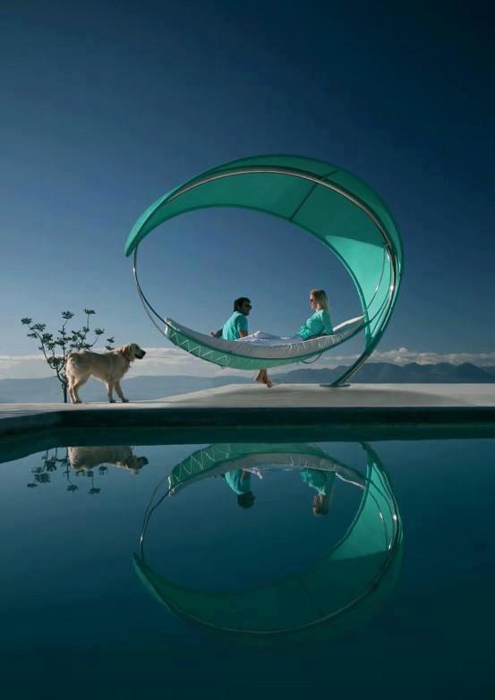 تصميم جميل مناسب للحدائق أو الشواظئ ... هي مرجيحة او قد تكون سرير متأرجح وله ظليلة بالأعلي لحجب الشمس .
