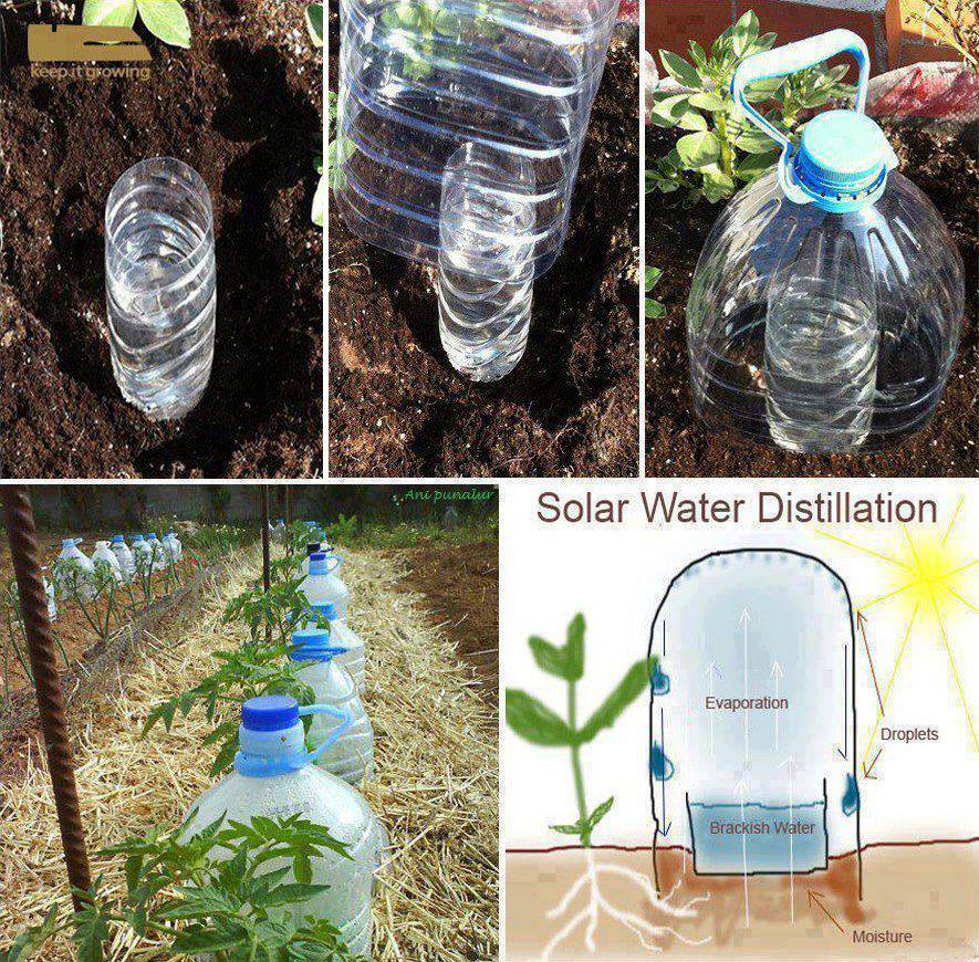 حرارة الشمس ستقوم بتبخير الماء فيتكثف الماء علي سطح الزجاجة الكبيرة وينزل إلي التربة ... الفائدة أن هذه الفكرة تنظم عمليت ري الزرع علي فترة طويلة مثل طريقة الري بالتنقيط .. وذلك دون الأحتياج لأجهزة متطورة ومكلفة .