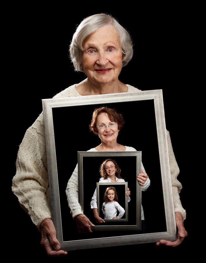 فكرة جميلة لتداخل عدد من البراويز بحيث يكون صورة كل برواز لشخص يحمل برواز آخر وهكذا .. والجميل أن يوضع التسلسل الأسري من الجدة إلي الأم إلي الحفيدة وهكذا .