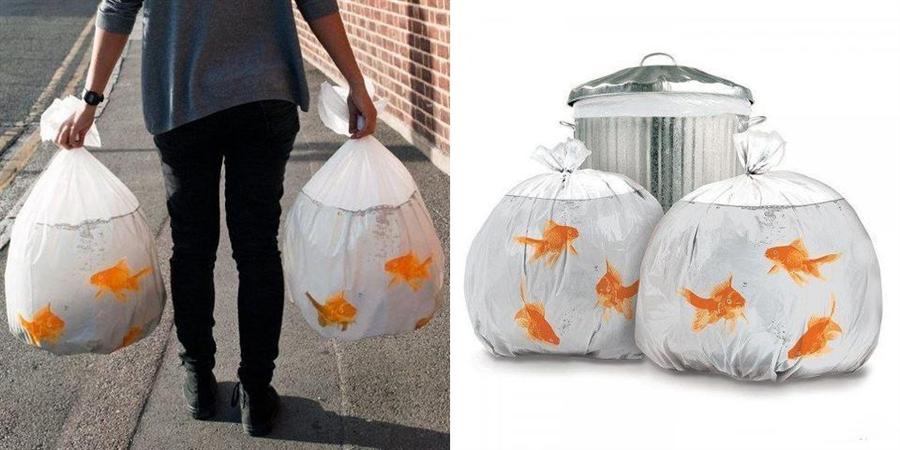 غالباً لونها اسود وشكلها قبيح ... فلماذا لا تكون جميلة ... وقد تتجلي الأفكار مثل هذه الفكرة وكأن الكيس لا يحتوي علي القمامة بل علي أسماك الذينة !!