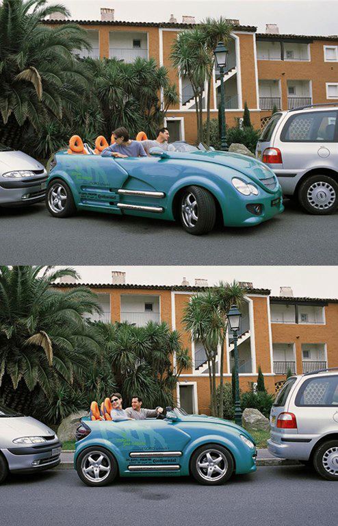 فكرة جميلة جداً لتصميم سيارة بحيث أنها قابلة للكمش حيث تستطيع أن تقلل من طولها لتستطيع الركنة في الأماكن الصغيرة الضيقة ... وتعود مرة أخري لتأخذ أربعة ركاب وتكون سيارة كبيرة وواسعة .